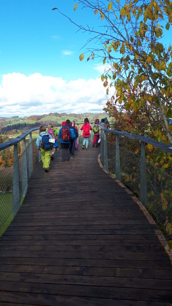 «Wir sind zuerst mit dem Zug nach Mogelsberg gefahren. Dort wanderten wir zum Baumwipfelpfad. Auf dem Weg hatte es 88 Treppenstufen.» «Am spannendsten fand ich die Posten, weil ich dort etwas über Tiere und Bäume lernen konnte.» «Am spannendsten fand ich die Posten, weil ich dort etwas über Tiere und Bäume lernen konnte.» «Ich habe gelernt, dass ein ausgewachsener Steinadler 5kg schwer ist und im Flug 7kg tragen kann.» «Der Balancierparcour war cool.» «Es gab eine grosse Schaukel. Einige Kinder haben gestossen. Darum war es sehr schnell.»