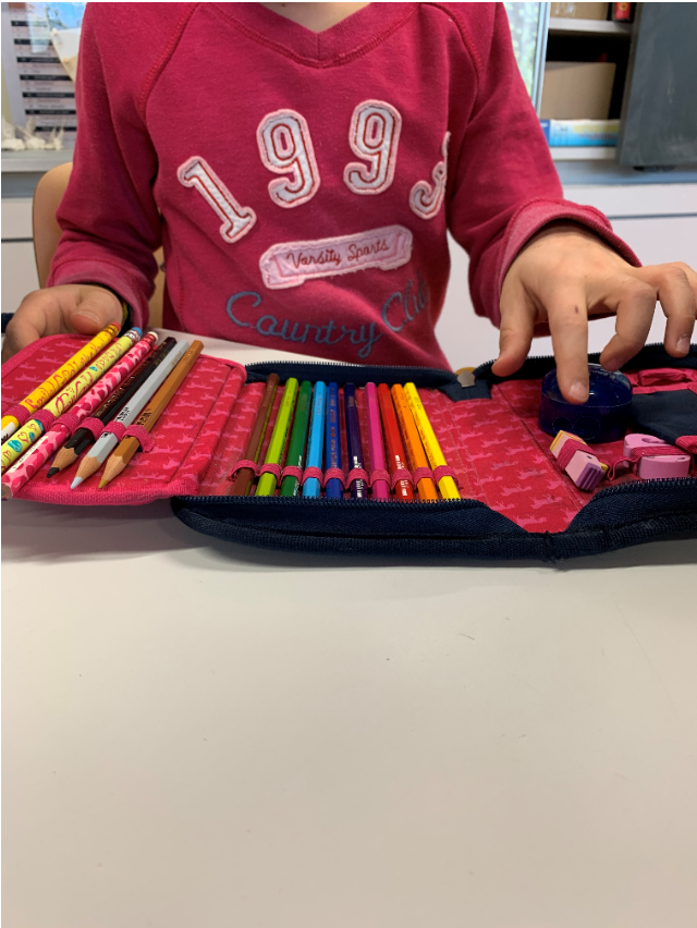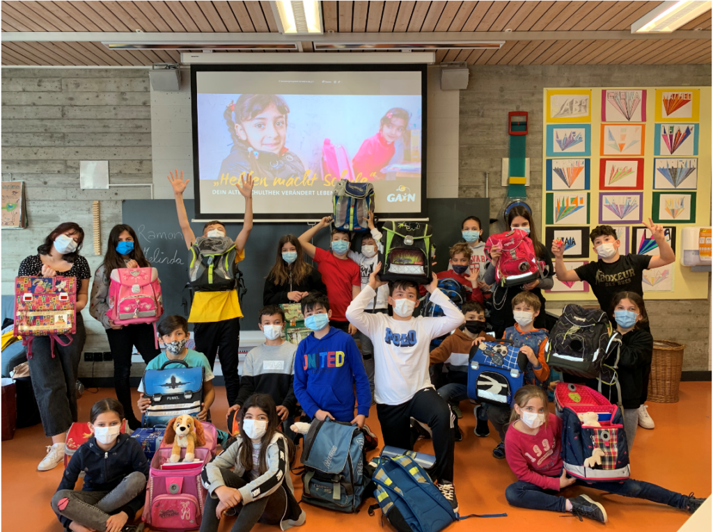 Gain Switzerland setzt sich in armen Regionen, sowie in Flüchtlingscamps von Griechenland für betroffene Menschen ein. Unter anderem ermöglichen sie vielen Kindern Schulbildung. Von Ostern bis zu den Frühlingsferien hat die 5. Klasse b gebrauchte Schultheks, Hefter, Etuis, Stifte, Farbstifte, Spitzer, Radiergummis, T-Shirts und Plüschtiere gesammelt. Vor den Frühlingsferien kamen dann zwei Mitarbeiterinnen von Gain und haben mit der Klasse die Theks mit dem entsprechenden Material gefüllt. Diese 19 Schultheks werden mit dem nächsten Transport an Kinder überreicht, welche sich kein eigenes Schulmaterial leisten können.