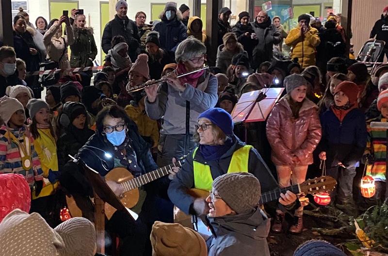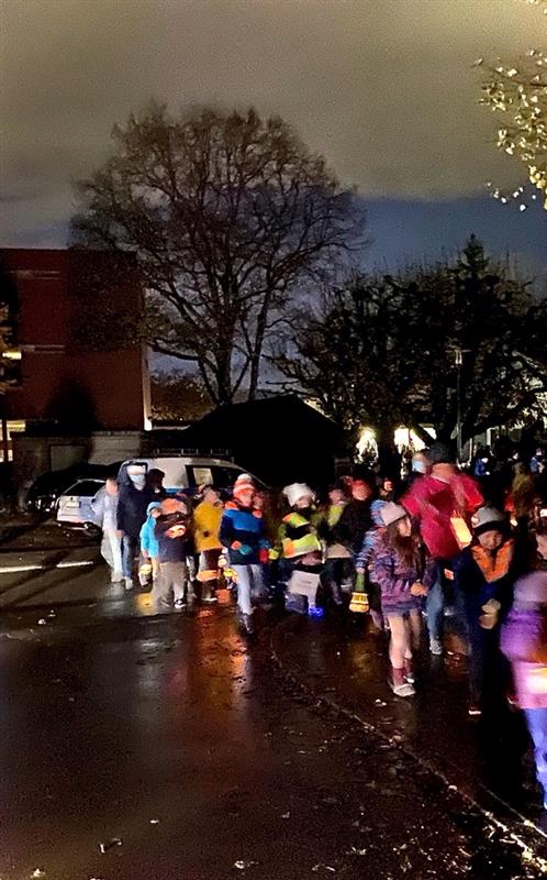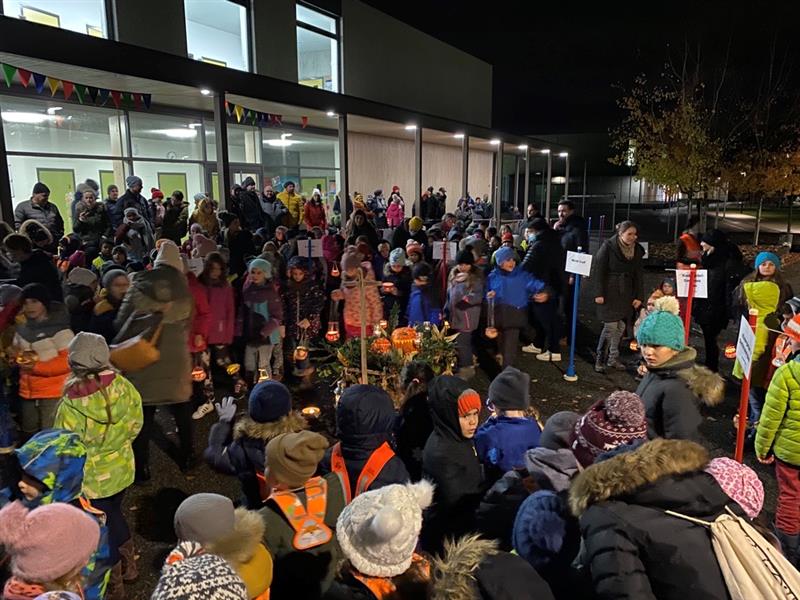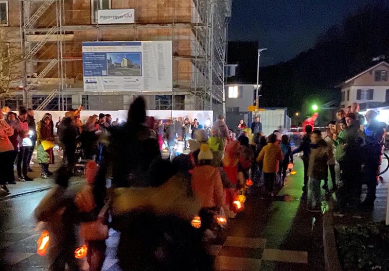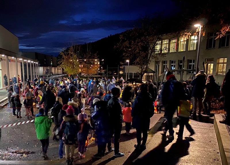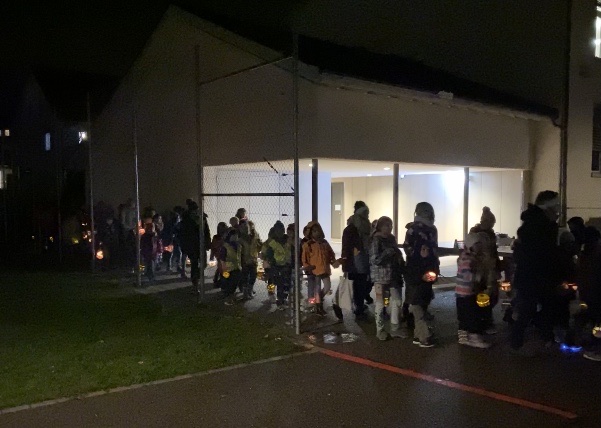 Ab 17.15 Uhr konnten sich die Teilnehmenden mit Würstchen, Brot und Tee/ Glühwein verpflegen. Um 18.00 Uhr versammelten sich die Klassen bei ihren Klassenlehrpersonen auf dem Pausenplatz. Kurz darauf startete der Umzug, angeführt von den Elgger Tambouren. Sie führten die Kinder via Kirchstrasse/ Bahnhofstrasse zurück zum Schulhaus. Rund um den wundervoll geschmückten Leiterwagen sangen die Kinder mit musikalischer Begleitung verschiedene Lieder.