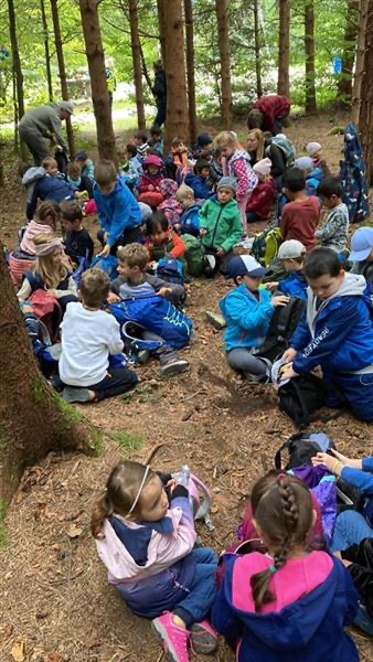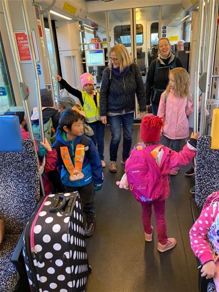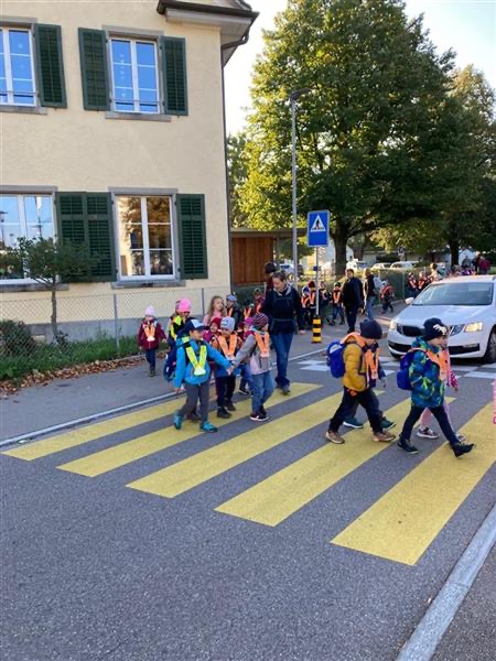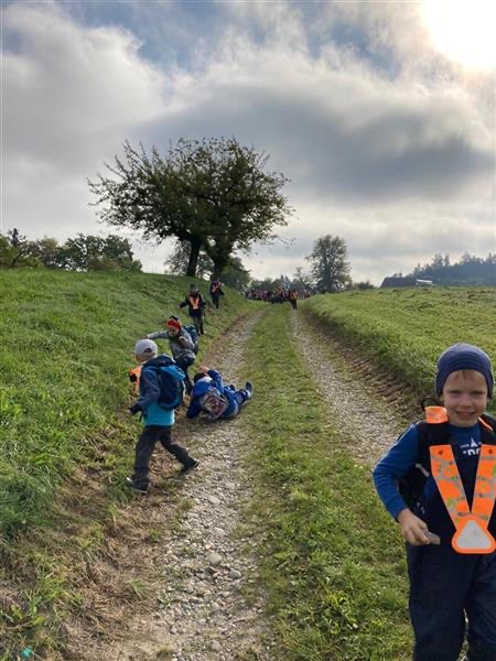 „Endlich Herbstwanderung! Warm angezogen mit guten Schuhen und vollgepackten Rucksäckchen machte sich am Morgen die muntere Schar vor dem Chindsgi bereit. Letzte Ermahnungen, dann ging es in Zweierreihe zum Bahnhof. Im gut besetzten Zug fuhren wir nach Winterthur Seen. Sind alle ausgestiegen, kein Rucksack im Zug liegen geblieben…? In einer langen Zweierreihe mussten wir vom Bahnhof aus erst auf die andere Seite von Seen gelangen, dann durften die Kinder endlich frei herumspringen. Das Überqueren der Strasse klappte schon ganz gut. Znünipause im “Paradies”. Inzwischen hatte die Sonne den Nebel verdrängt und wir konnten uns wieder aufwärmen. Manchmal war der Weg nur schmal und ein bisschen unheimlich. Ob es vielleicht doch Wölfe gibt hier im Wald? Mittagessen gabs beim Eschenbergturm. Weil bereits eine ganze Schule hier am Essen und Spielen war, suchten wir uns ein Plätzchen zwischen den Bäumen. Auf dem Spielplatz im Stadtpark durften die Kinder noch einmal Pause machen und spielen, dann hiess es aber schon bald zusammenpacken und mit dem Zug nach Kollbrunn zurück.“